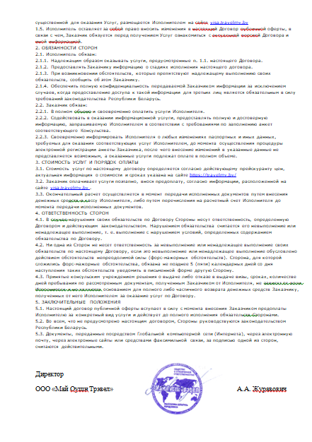 Принятые консульским учреждением решения о выдаче либо отказе в выдаче визы, сроках, количестве дней пребывания по рассмотренным документам, полученным Заказчиком от Исполнителя, не зависят от воли Исполнителя и не являются основанием для полного либо частичного возврата денежных средств Заказчику, полученных от него Исполнителем за оказание услуг по Договору.